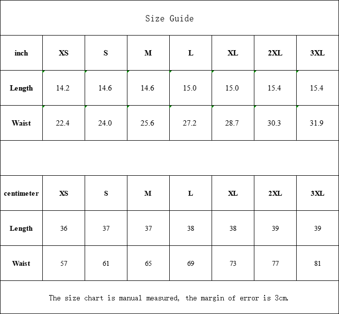 | Waist | 22.4 | 24.0 | 25.6 | 27.2 | 28.7 | 30.3 | 31.9 |